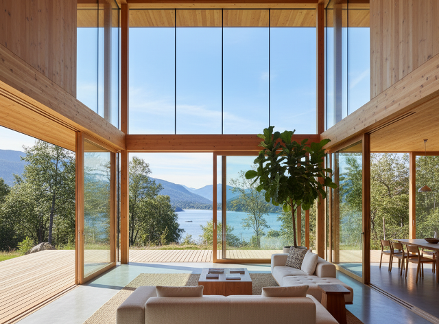 CLTは非常に高い強度を持つため、壁や柱の数を減らすことができ、大きな窓や吹き抜けなど、開放的な空間をつくりやすくなります。たっぷりの光と風を取り入れ、外の景色を家の中から楽しむことができます。